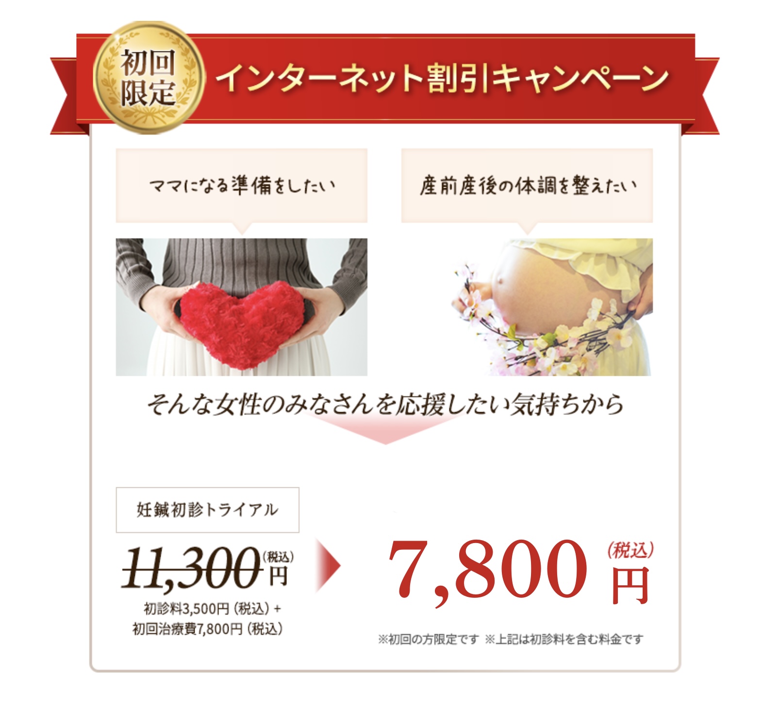「妊娠中だけども不快な症状に耐えることがツラい…」「鍼灸治療に不安を感じる…」という方に初診トライアルをご用意してあります。